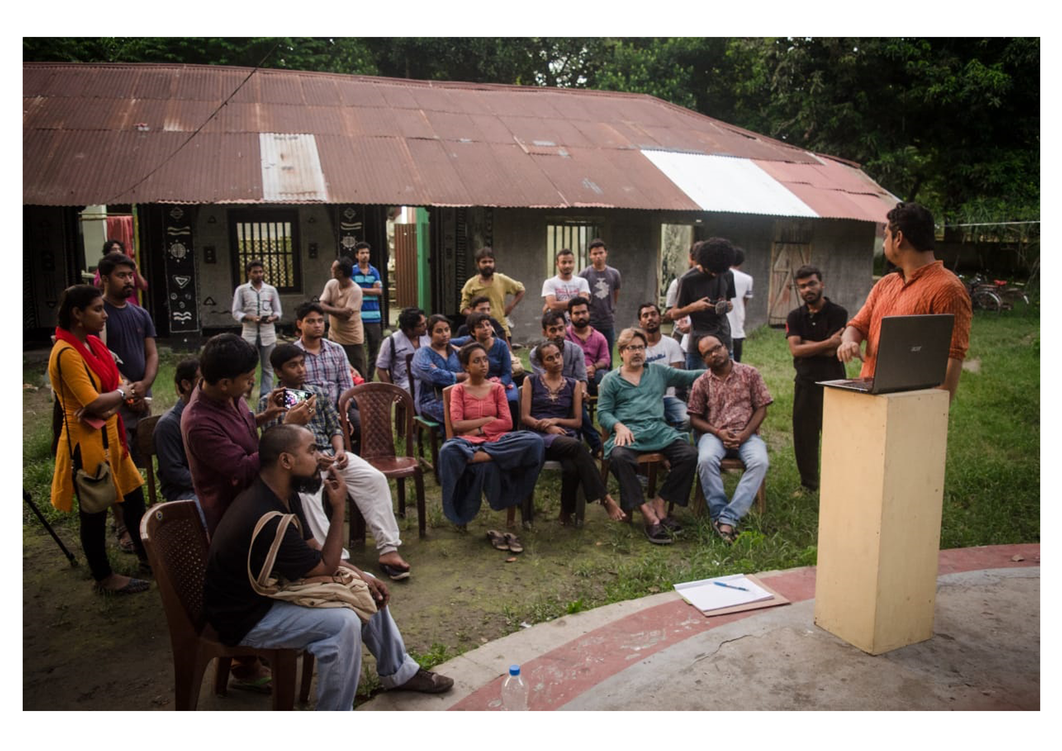The residency embodied an experience of openness, the perception of pluralism, and the vastness of possibilities fostered by interdisciplinary proliferation. It emerged from the existential crisis of social disorder where art is interlaced with the pulse of everyday struggles. It became a space to explore the practices that can emerge through collective processes. In this creative crucible, Kolkata-based visual artist Sambaran Das and performance artist Syed Taufiq Riyaz unfolded two decades of their journey, while voices like Uma Banerjee, Priya Guha Roy, Supriyo Karmakar, Ashish Dhali, and Rocky Majumder lent their performances to the air. Amid these unfolding narratives, singer and songwriter Arjun Kar chanted songs of radical longing—anthems echoing the pulse of the working class.