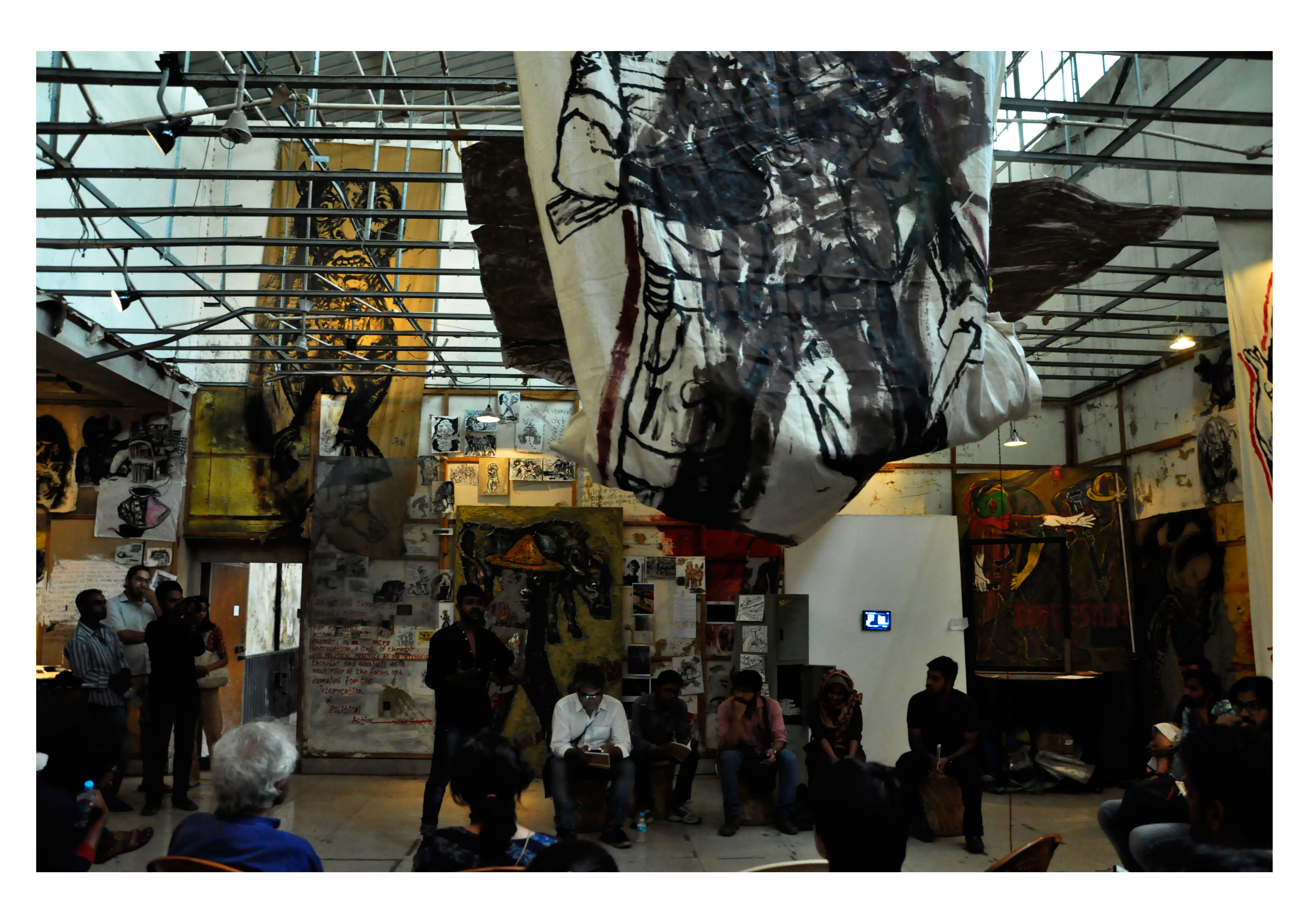 Simultaneously, video, audio, and written documentation captured interviews and interactions with practitioners, contemporary artists, activists, theoreticians, and academics—each contributing impressions of collectivity gathered over the past year. These surface and sub-surface engagements culminated in a panel discussion, where I invited five practitioners, to whom I share both artistic and political affinity, to exchange their praxis, ideas, and experiences. Their presence sparked new modes of conversation and confrontation with the display—for both myself and the audience.