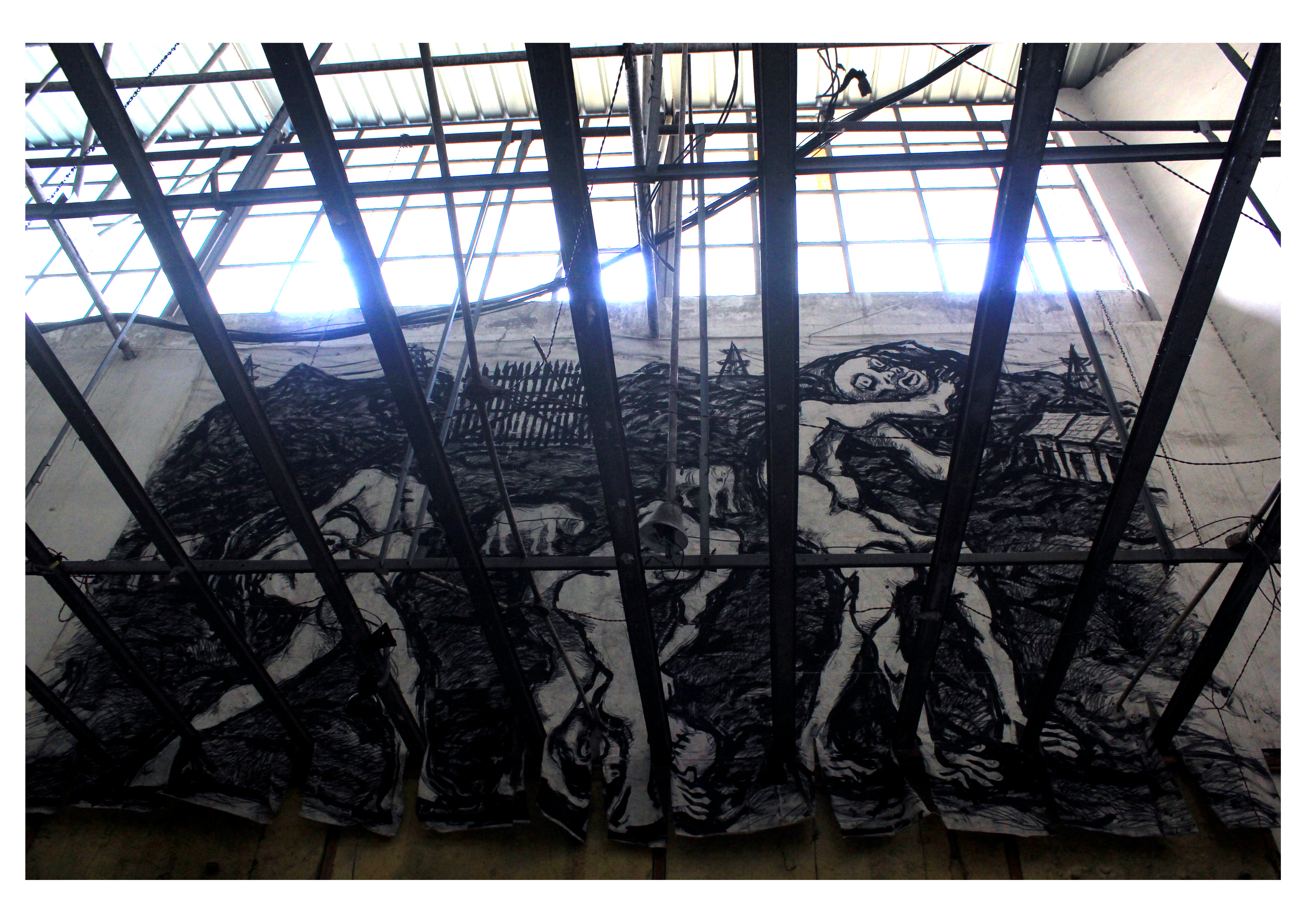 Once a thriving theatre room, I discovered a space half-burnt and shrouded in dust. Over the course of fifteen days, I endeavored to reposition diverse materials—each with its own fusibility—and to redistribute spectacles in varying sizes, textures, words, volumes, and mediums. The spectacle was meant to evolve into an imaginative visual dictionary, where my core idea could unfurl in a non-linear, phenomenological manner. The visual regime of the eye is disrupted, allowing us to enter or exit the work with layers set both historically and politically.